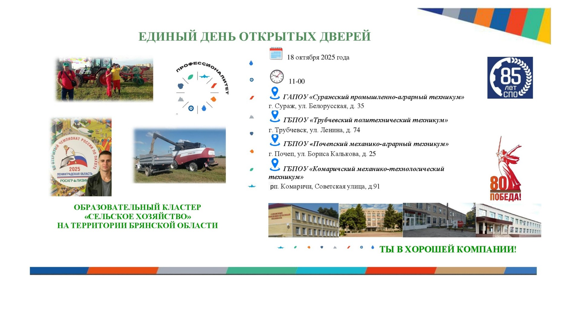18 октября 2025 года пройдёт масштабное мероприятие - «Единый день открытых дверей» Федерального проекта «Профессионалитет» для специальностей СПО в образовательном кластере «Сельское хозяйство» на территории Брянской области.
