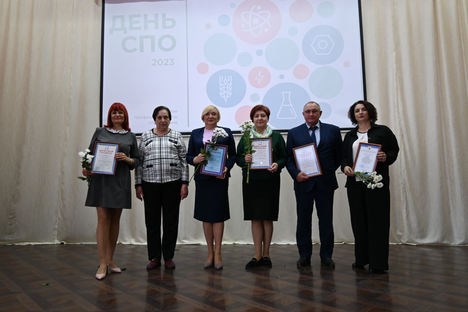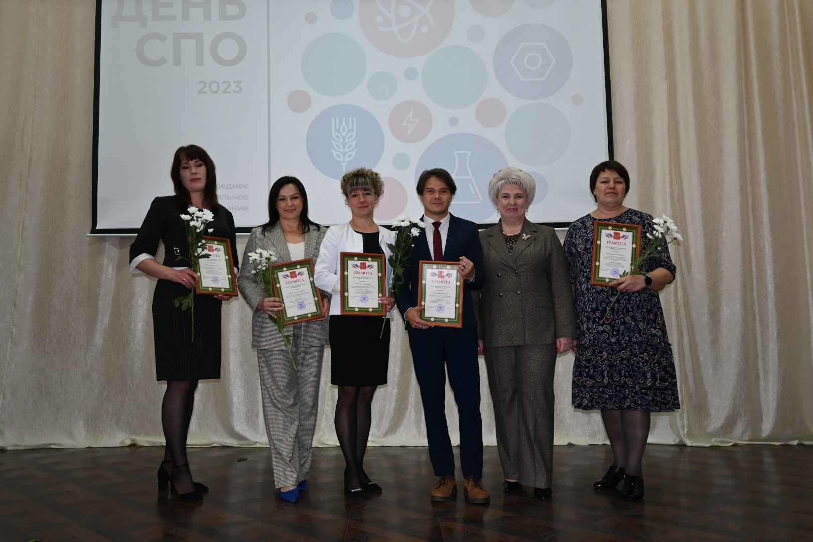 Они поздравили собравшихся в зале и обратились со словами благодарности к руководителям профессиональных образовательных организаций, преподавателям, мастерам производственного обучения и ветеранам педагогического труда. В этот день лучшие работники системы среднего профессионального образования были награждены ведомственными наградами: знаком отличия Министерства просвещения Российской Федерации «Отличник просвещения», почетным званием «Почетный работник сферы образования Российской Федерации», а также Почетными грамотами департамента образования и науки Брянской области, Почетными грамотами Федерации профсоюзов Брянской области, грамотами исполнительного комитета Общероссийского Профсоюза образования и наградами Общественного Совета при департаменте образования и науки Брянской области.
