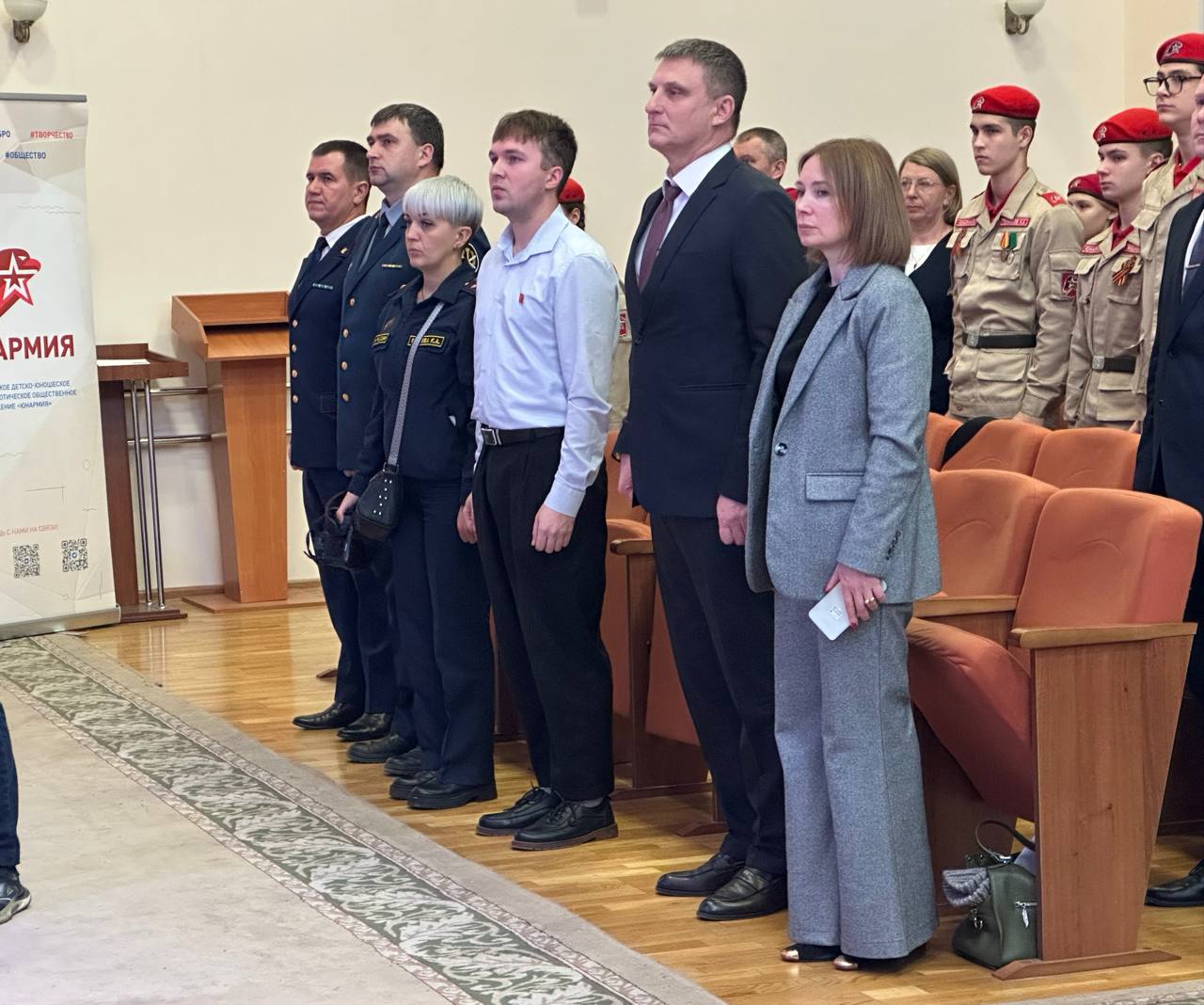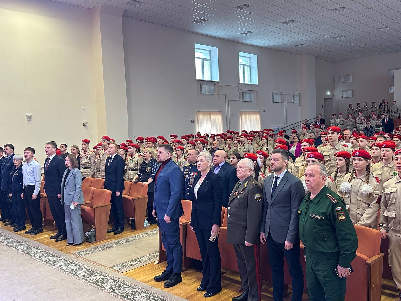 Торжественное собрание объединило в школьном актовом зале почетных гостей, среди которых: представители Правительства Брянской области, областной Думы, военного комиссариата, регионального отделения ДОСААФ России, Управления ГО и ЧС, офицеров и ветеранов Вооруженных Сил РФ, а также юных патриотов нашей страны - юнармейцев и их наставников.