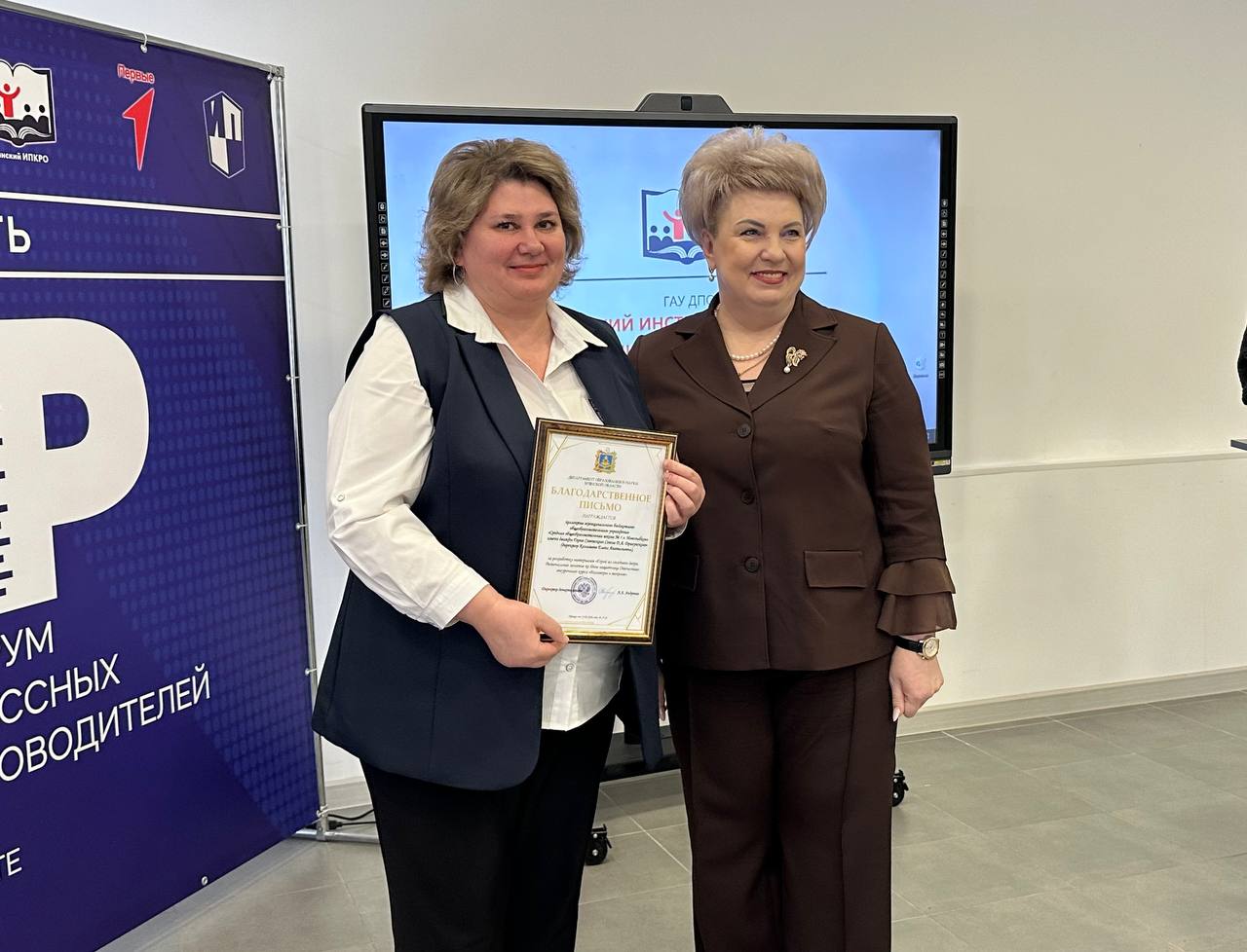 В рамках открытия форума состоялась церемония награждения. Авторский коллектив Новозыбковской СОШ № 1 под руководством Колышевой Елены Анатольевны отмечен Благодарственным письмом департамента образования и науки за разработку материала «Герои из соседнего двора» для занятия «Разговоры о важном», приуроченного ко Дню защитника Отечества. Награду коллективу образовательного учреждения передала директор департамента.