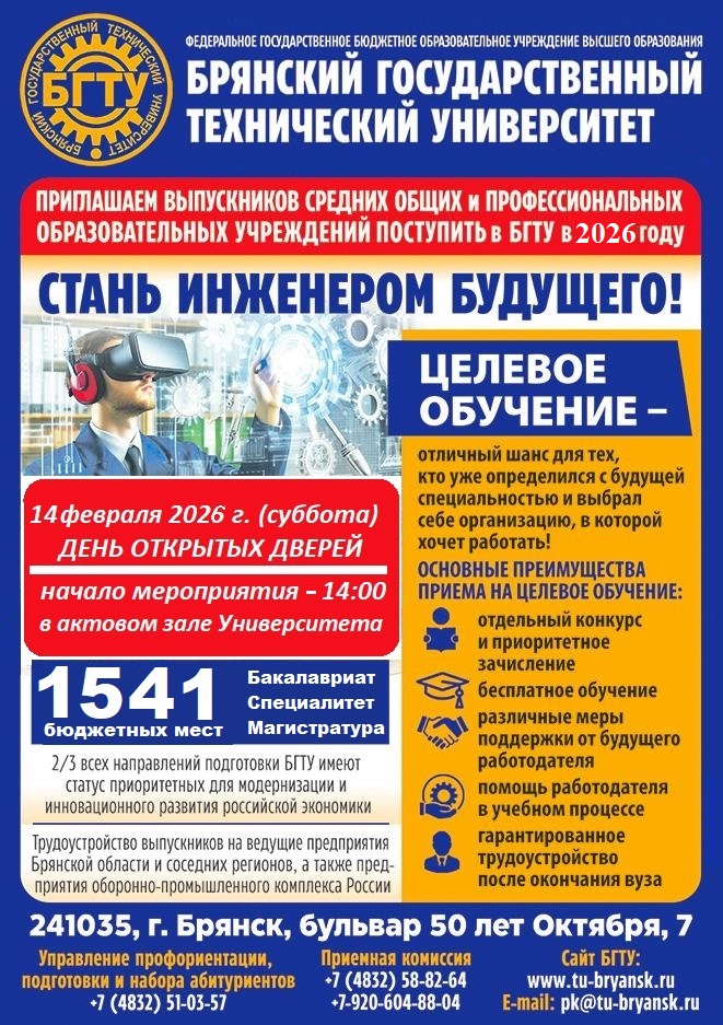 14 февраля 2026 года (суббота) БРЯНСКИЙ ГОСУДАРСТВЕННЫЙ ТЕХНИЧЕСКИЙ УНИВЕРСИТЕТ проводит ДЕНЬ ОТКРЫТЫХ ДВЕРЕЙ (бульвар 50 лет Октября, д. 7, учебный корпус № 2, 3-й этаж, актовый зал университета).