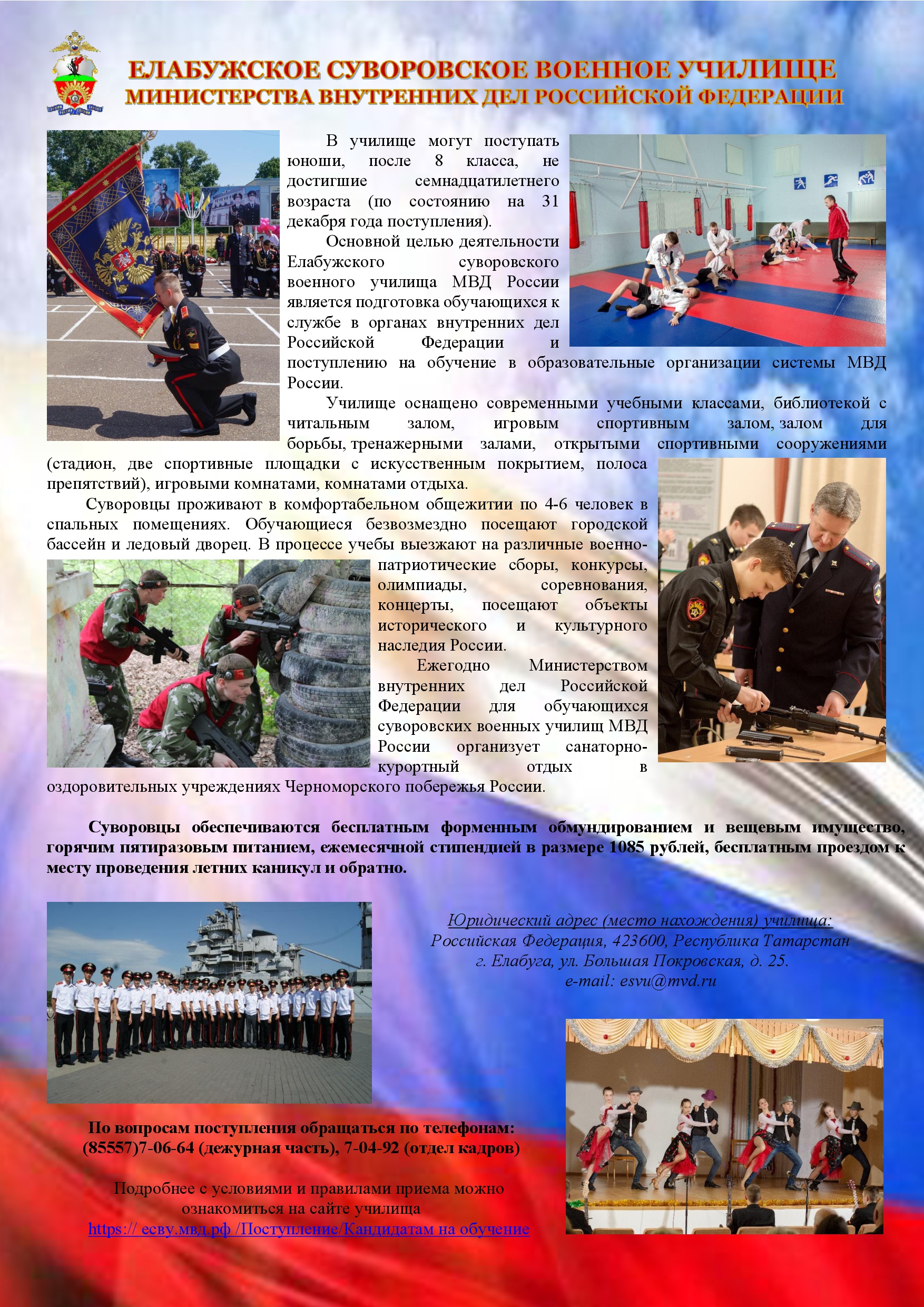 Елабужское суворовское военное училище МВД России информирует обучающихся восьмых классов (юношей) и их родителей (законных представителей) о возможности поступления на обучение в училище в 2026 году.