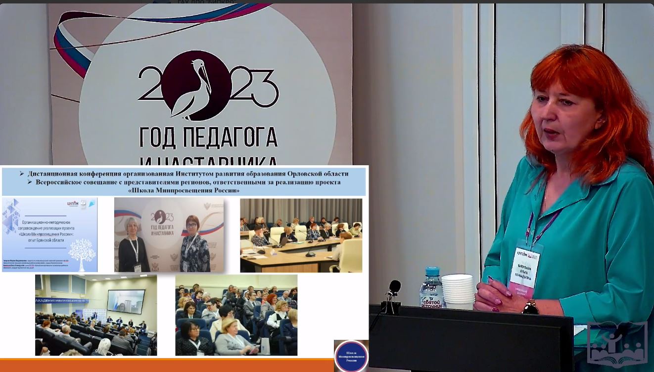 Более 50 представителей образовательных организаций приняли участие в работе секции «Реализация проекта «Школа Минпросвещения России»: методическое сопровождение и этапы масштабирования». Работа секции организована совместно с Орловским институтом развития образования; опыт региона представила Малёваная Людмила Ивановна, старший методист отдела формального дополнительного профессионального образования и мониторинга БУ ОО ДПО «Институт развития образования». Опытом работы поделились участники проекта 2022 и 2023 годов по направлениям «Учитель», «Здоровье», «Знание», а также представители системы образования Смоленской, Белгородской, Кировской областей.