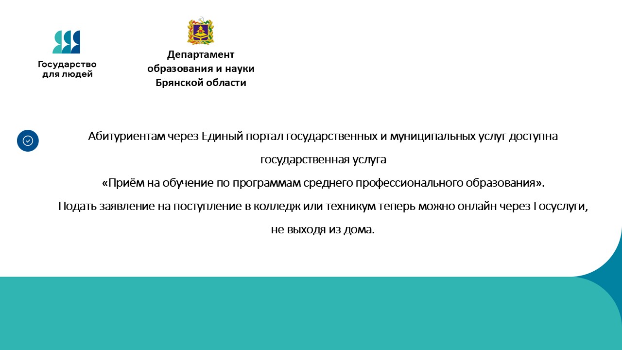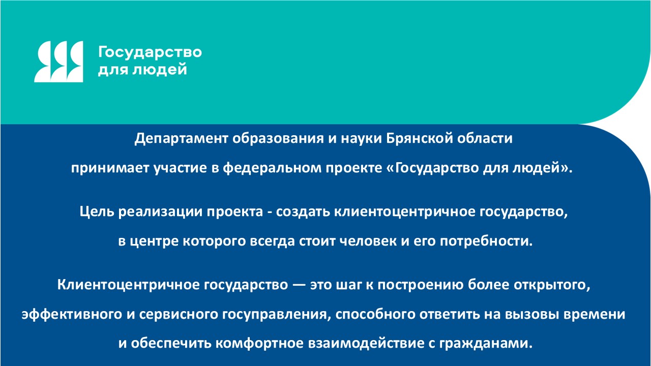 Департамент образования и науки Брянской области принимает участие в федеральном проекте «Государство для людей». Цель реализации проекта - создать клиентоцентричное государство, в центре которого всегда стоит человек и его потребности.