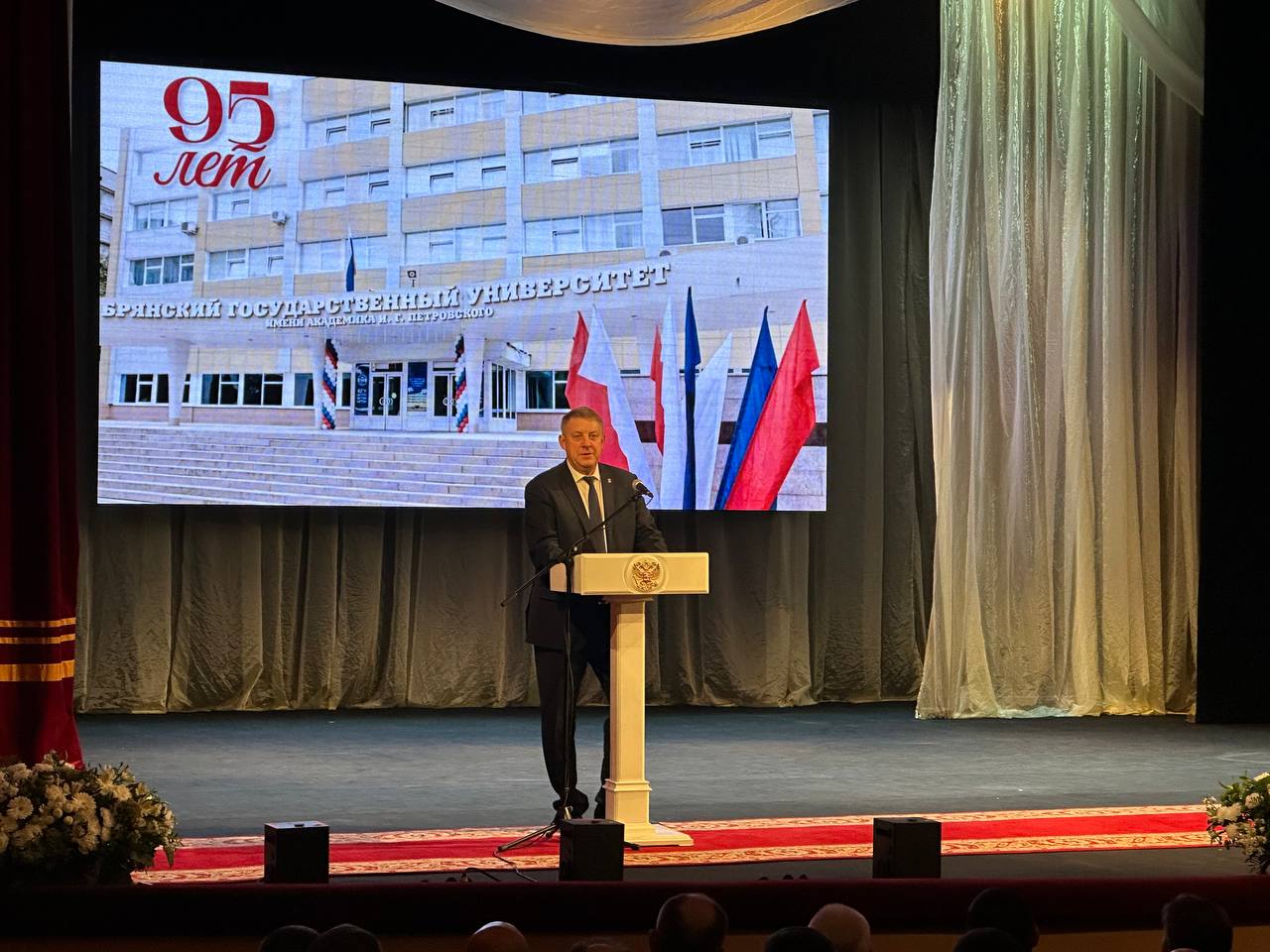 С торжественной речью к коллективу вуза-юбиляра со сцены обратился Губернатор Брянской области. Александр Васильевич отметил ключевые этапы истории учебного заведения, вспомнив великие личности, которые стояли у истоков университетской семьи.