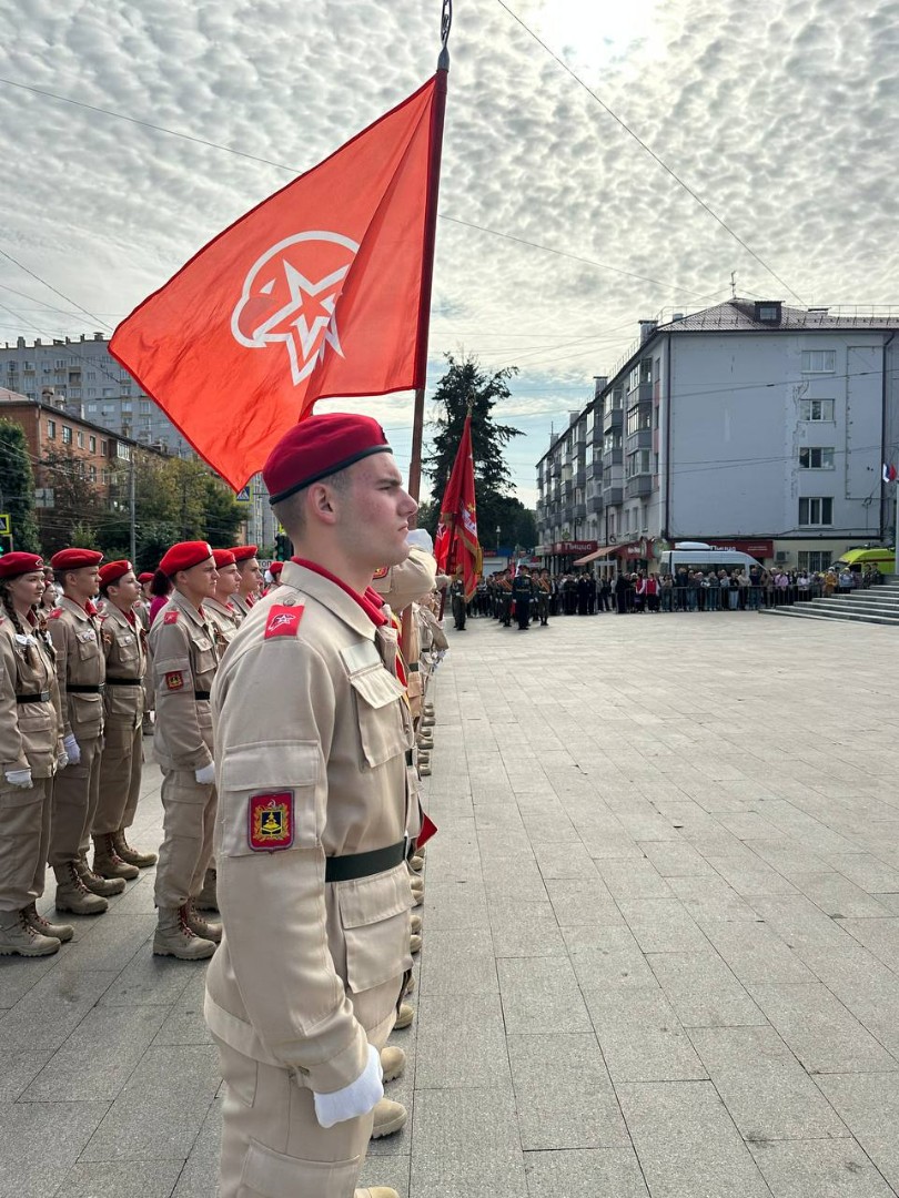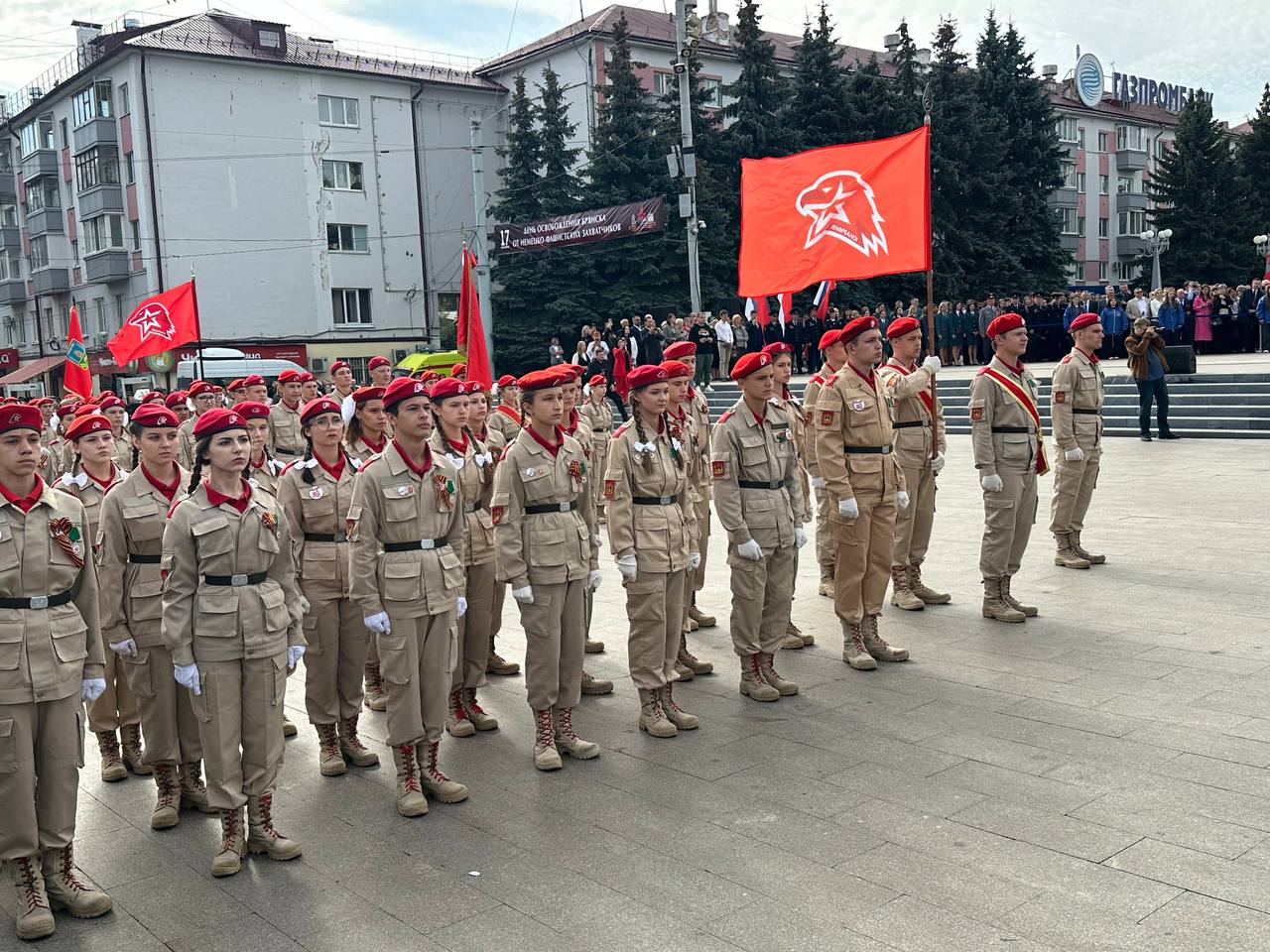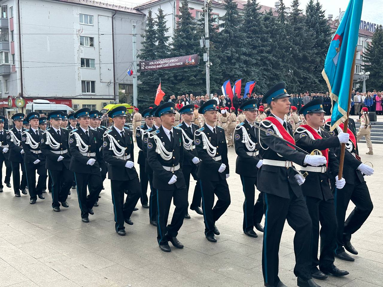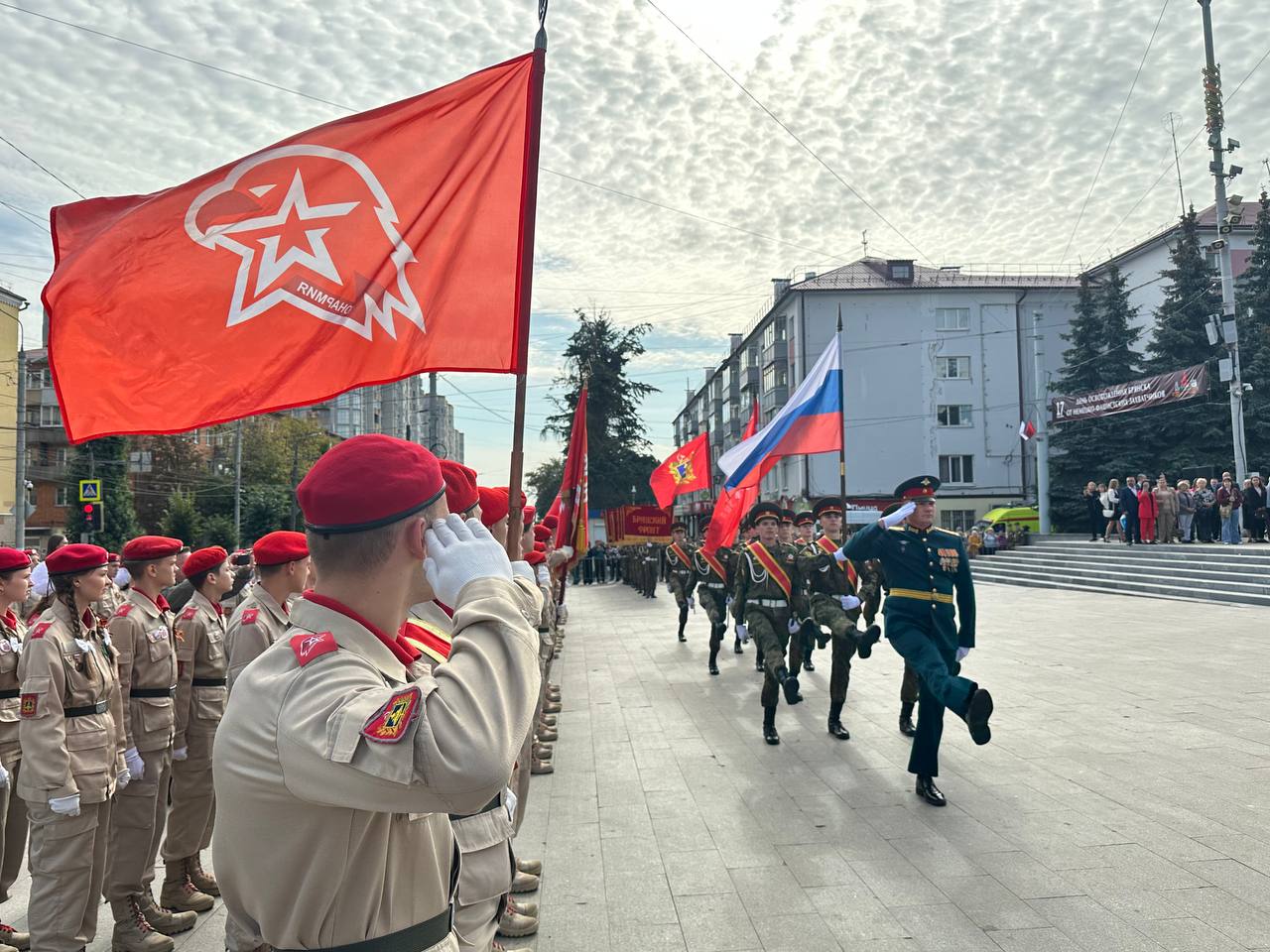 Парадным строем по площади Партизан под звуки маршей в исполнении сводного военного духового оркестра, чеканя шаг, прошли потомки героев-победителей и будущие защитники Отечества: отличники учёбы, победители и призёры соревнований различного уровня, военно-спортивных игр, обладатели золотых и серебряных знаков ГТО.