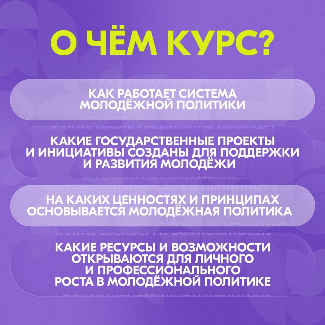 Курс состоит из пяти тем: «Ценности и смыслы молодёжной политики в России» посвящён приоритетам государства в отношении молодёжи и детей, роли Росмолодёжи и её задачах, стратегических документах и законодательных актах сферы молодёжной политики. Тема «Молодёжная политика и воспитание» – про акторов молодёжной политики и их работе с детьми и молодёжью. Тема «Ключевые организации в системе молодёжной политики, воспитания и просветительской деятельности» познакомит с деятельностью президентской платформой «Россия – страна возможностей», Российского общества «Знание» и АНО «ИРИ». Тема «Направления деятельности Росмолодёжи» расскажет об основные направлениях и проектах Росмолодёжи и как осуществляется их координация. Пятая тема – «Ключевые инструменты в сфере молодёжной политики» посвящена инструментам реализации молодёжной политики: от цифровых сервисов до деятельности общественных движений.